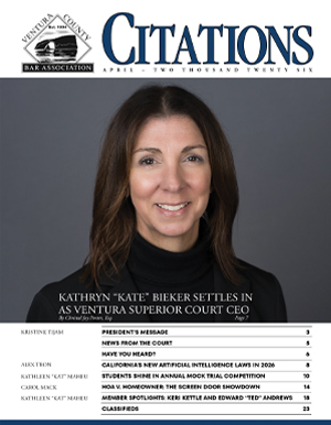 CITATIONS is the official publication of the Ventura County Bar Association. CITATIONS magazine is published monthly and is distributed to all members, including attorneys, superior court judges, justices and others involved in the legal and judicial systems of Ventura County.